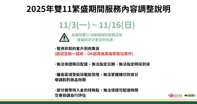 為確保雙11活動週期的服務品質 建議提早交寄您的包裹。建議提早交寄您的包裹。