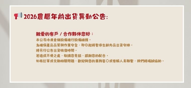 為確保產品品質與作業安全,即日起將暫停生鮮肉品出貨安排。