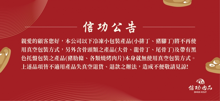 本公司以下冷凍小包裝產品(小排丁、豬腳丁)將不再使用真空包裝方式,